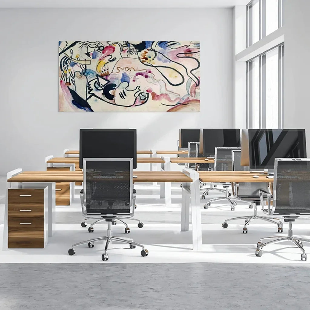 Avec Aquarell Nr. 8, Kandinsky pose un trait souple, presque musical, sur une nappe claire. Les lignes noires improvisent, les lavis roses, bleus et ocres se répondent sans s’imposer. Le résultat est aérien : une image qui apaise, qui laisse de l’espace et invite le regard à circuler.