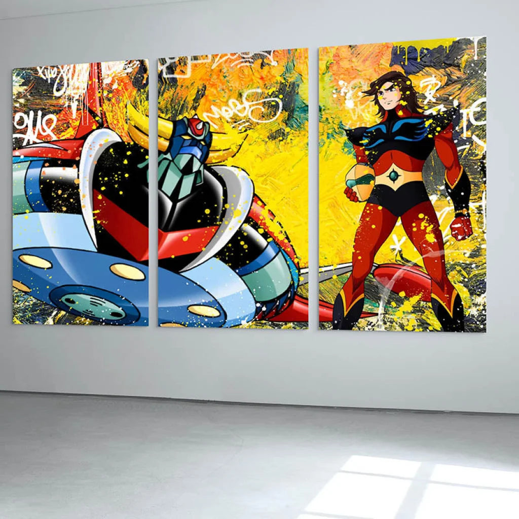 Ce tableau met en scène une illustration vibrante et dynamique de Goldorak et Actarus, avec des couleurs éclatantes et des détails remarquables. Divisé en trois panneaux, il offre une composition unique qui attire immédiatement l'œil. Le fond graffité aux tons jaunes et orangés donne une touche moderne et urbaine à cette pièce nostalgique. Ce tableau est parfait pour créer un point focal dans un salon, une chambre ou un bureau.