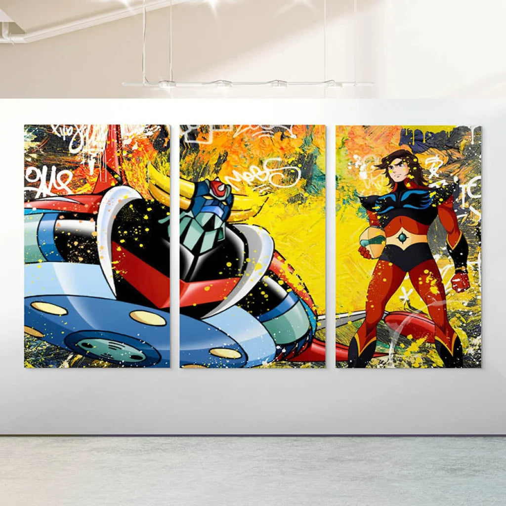Goldorak, héros de notre enfance, est bien plus qu'un simple personnage de dessin animé. Il incarne l'aventure, le courage et la nostalgie des années 80. Ce tableau triptyque célèbre cet univers mythique en combinant des éléments classiques avec une touche artistique contemporaine. Si vous êtes fan de mangas et de pop culture, c'est une pièce incontournable pour votre décoration murale.