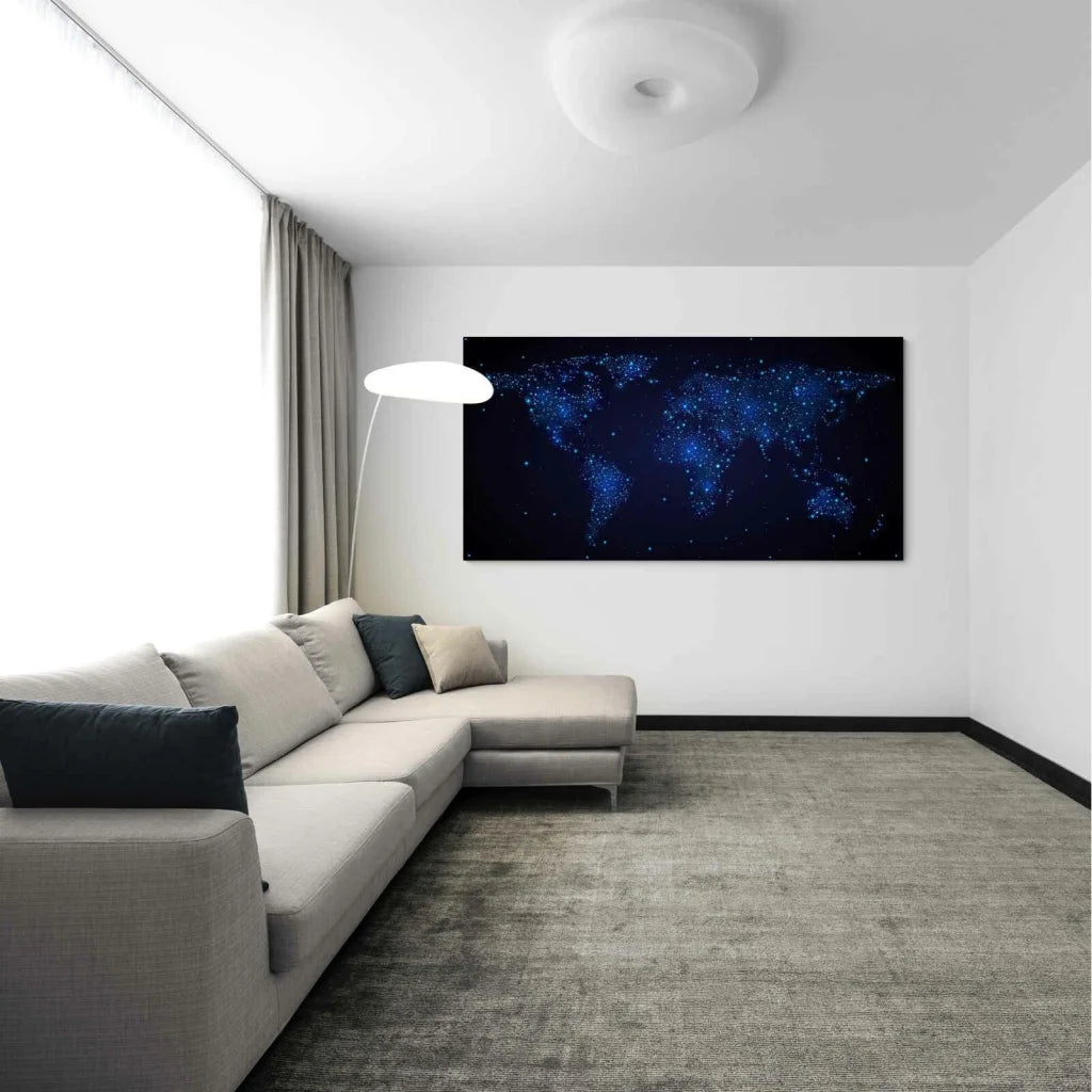 Ce tableau représente une carte du monde composée d'étoiles bleues sur un fond noir. Grâce à son aspect lumineux, il apportera une touche finale à votre pièce.