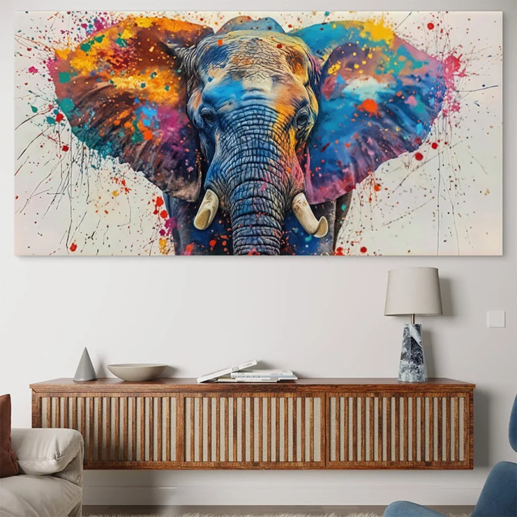 Ce tableau design met en scène un éléphant majestueux revisité façon street art, recouvert d’éclaboussures de peinture vives et dynamiques. Une œuvre forte, vibrante et pleine de caractère qui donnera à votre décoration murale une touche unique et sauvage.
