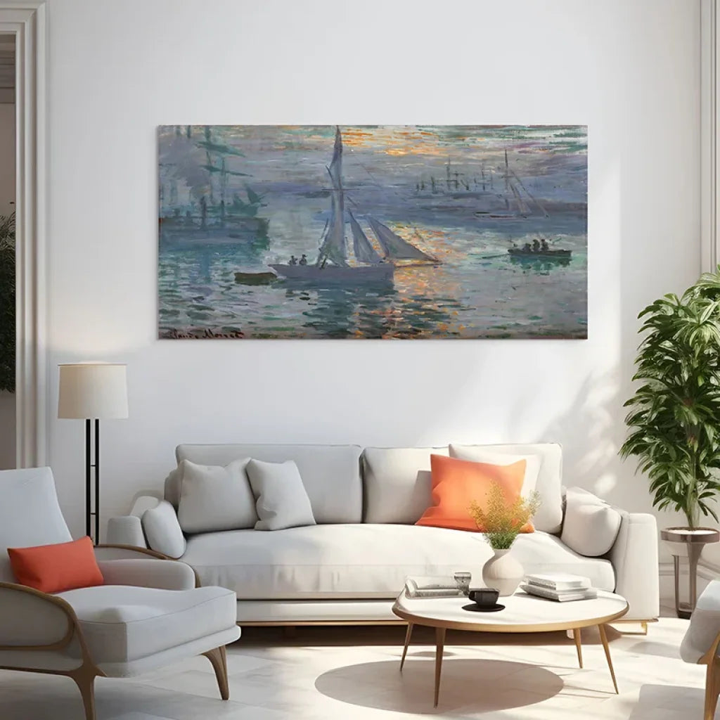 Nos reproductions haute définition respectent l’équilibre coloré de l’original : gris-bleu du port, transparences de la brume, orange cuivré du soleil et de son sillage.