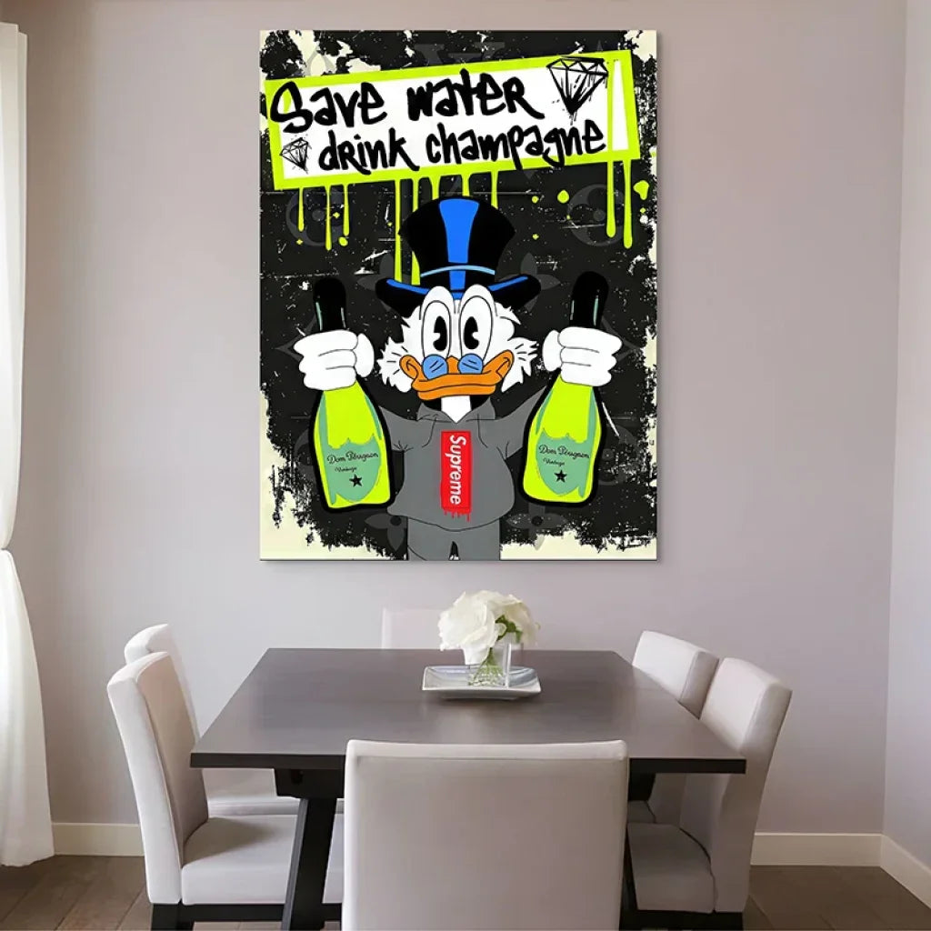 Sur fond noir texturé, le célèbre canard au look extravagant brandit fièrement deux bouteilles de champagne, symbole d’excès et de réussite. Les éclaboussures de peinture, les tons néon et les détails graffiti apportent un effet visuel fort, parfait pour une déco murale contemporaine et pleine de personnalité.