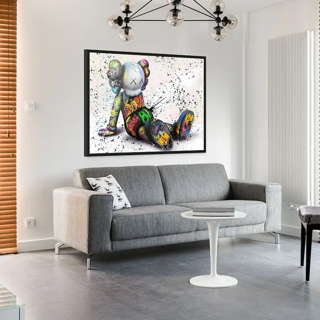 Besoin d’une pièce forte pour votre déco urbaine ? Rebel Pop capte l’énergie du Street art avec un personnage assis recouvert de lettrages néon et d’éclaboussures dynamiques. Couleurs vibrantes, mouvement, attitude : ce tableau Kaws donne immédiatement du caractère à la pièce. (Œuvre inspirée de l’esthétique urbaine contemporaine, non affiliée.)