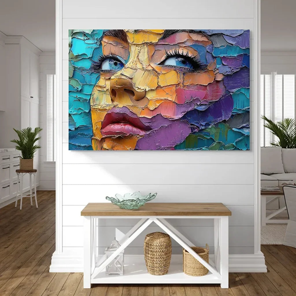 - Impact immédiat : un portrait texturé et multicolore qui dynamise la pièce et attire naturellement le regard.