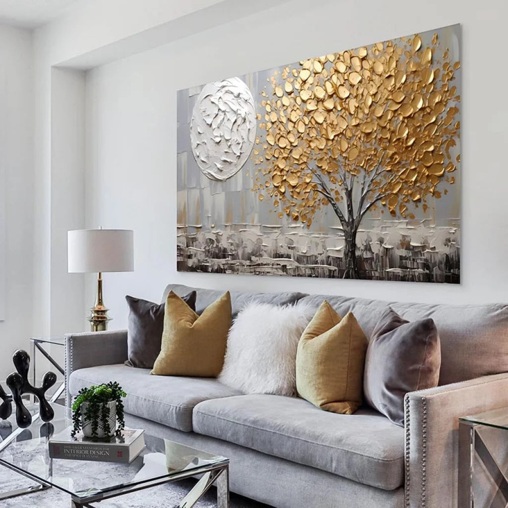 • Élégance et Simplicité : La combinaison de l'arbre doré et du fond lunaire crée une harmonie visuelle qui est à la fois simple et sophistiquée. C'est une œuvre qui attire le regard sans être trop imposante.