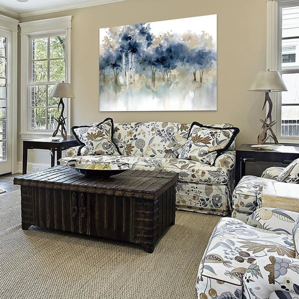 Découvrez le charme captivant du tableau "Bord de l'Eau I", une illustration moderne représentant une forêt bleue envoûtante. Les dégradés subtils, mêlant nuances de bleu clair à des tons plus foncés, donnent vie à ce paysage apaisant, rappelant le doux frémissement des feuilles sous la caresse d'une brise légère. La touche discrète de gris évoque une ambiance brumeuse, créant une toile chargée d'émotions. Parfait pour ajouter une note douce et romantique à votre espace, ce tableau déco de salon s'intègre merveilleusement bien dans un cadre moderne, que ce soit dans une chambre ou un séjour.