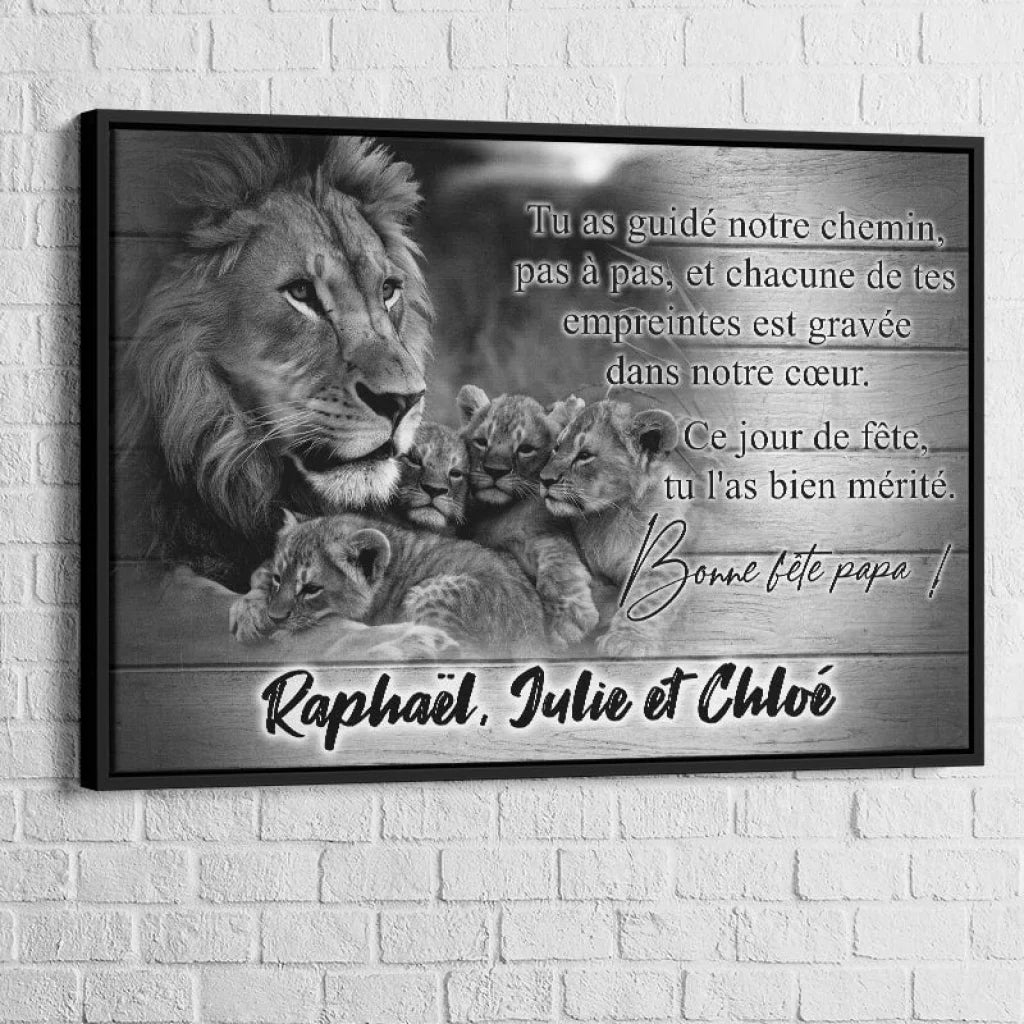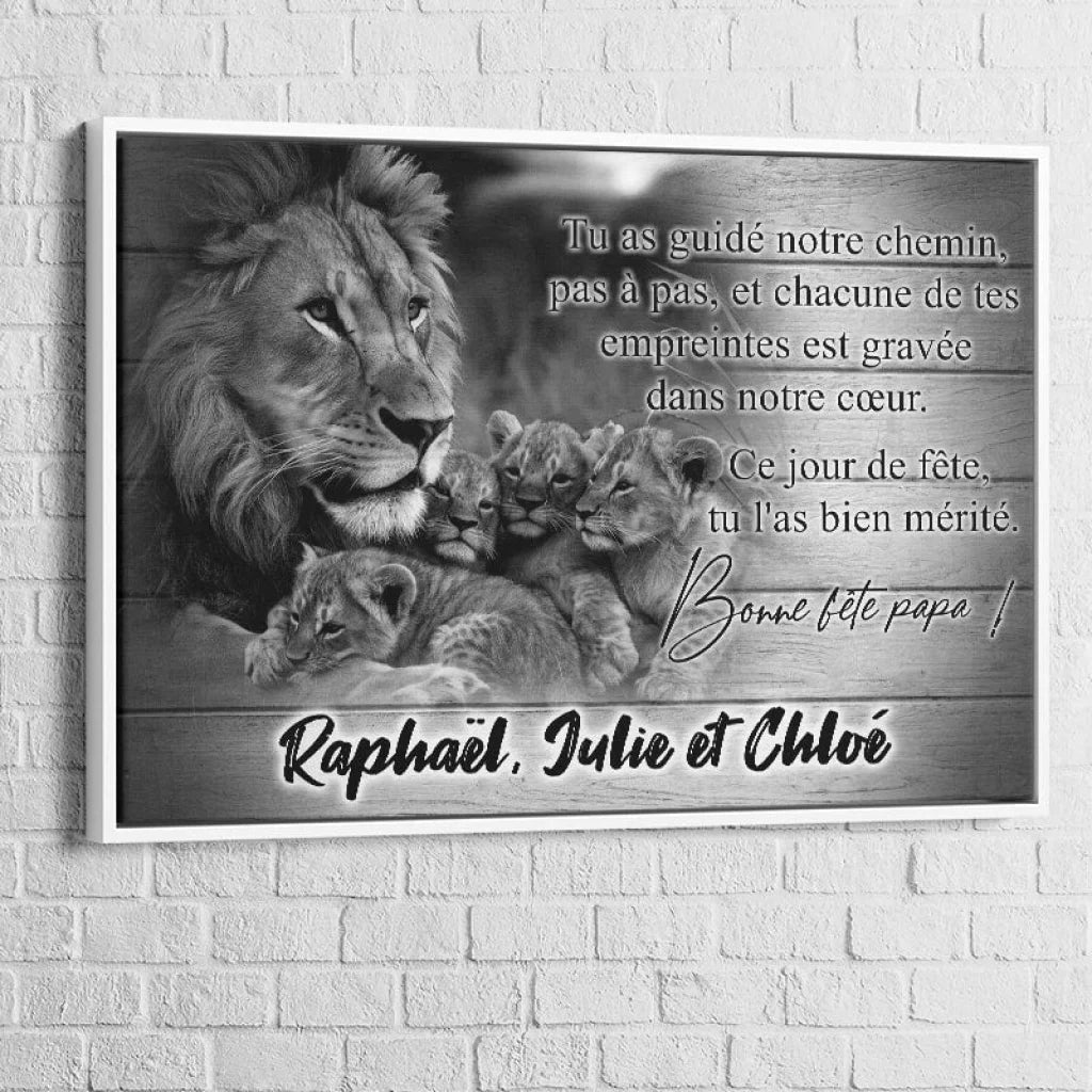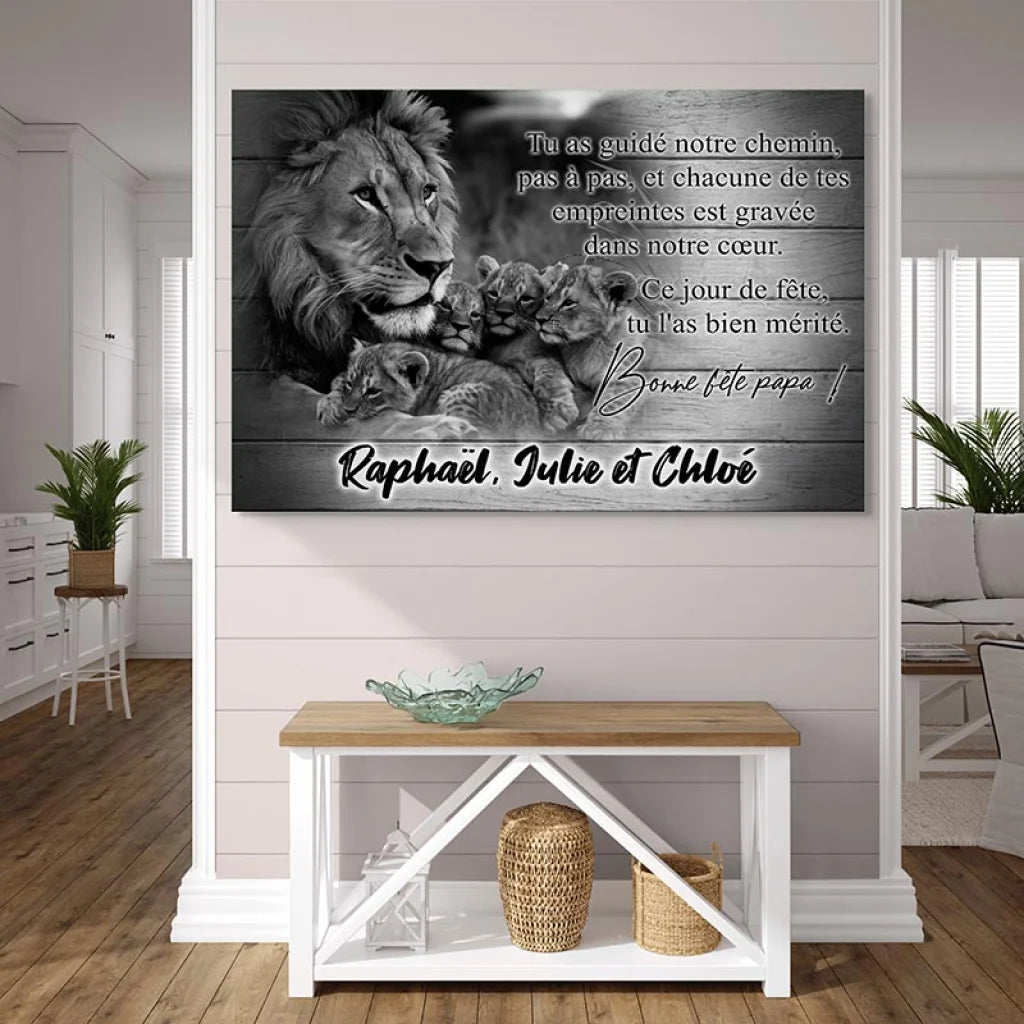 Ce tableau, représentant une scène touchante de famille de lions, symbolise la protection, l'amour et la guidance paternelle. Les détails minutieux et la représentation émotionnelle en font une pièce centrale impressionnante pour tout foyer. Personnalisable avec jusqu'à six prénoms, il s'adapte parfaitement pour célébrer votre propre famille et les liens uniques qui vous unissent.