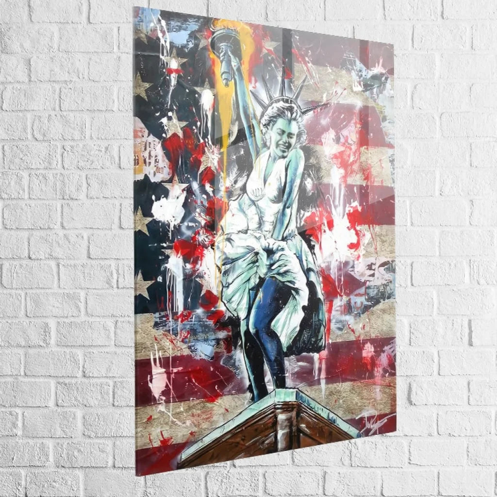Avec ce visuel percutant, Marilyn Monroe devient la nouvelle Lady Liberty, symbole d’audace et de liberté, dans un univers américain déstructuré et coloré.