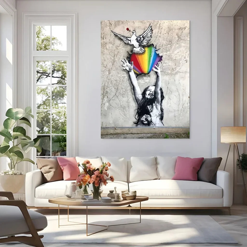 Accrochez la toile à hauteur des yeux, au-dessus d’un buffet ou d’un canapé. Misez sur des matières naturelles (lin, bois clair) et quelques accents métal noir pour rappeler la rue. Un éclairage chaud latéral fera scintiller l’arc-en-ciel et renforcera la sensation d’envol. Laissez 10 à 15 cm d’air autour du cadre pour que l’image respire.