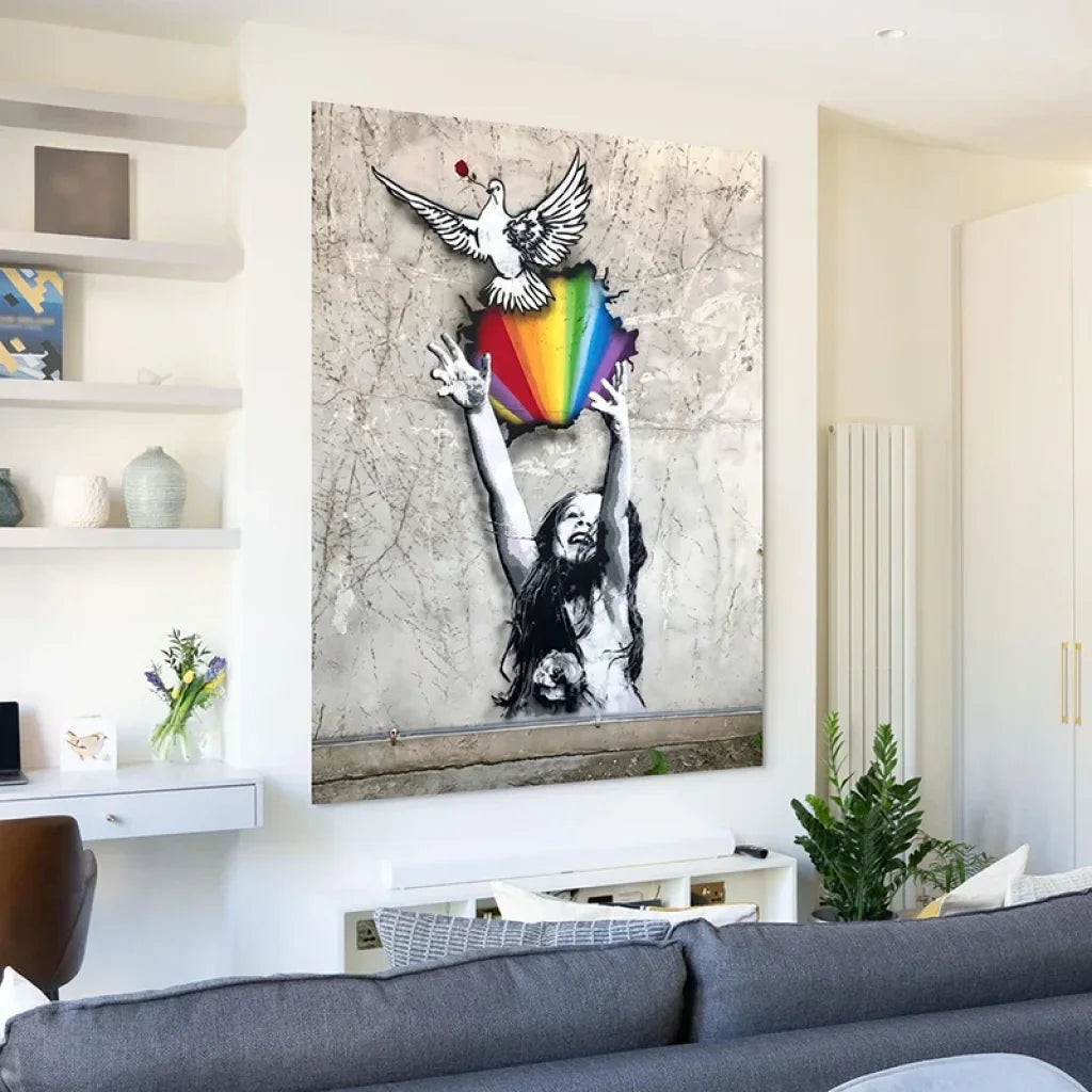 Un mur de ville, un pochoir délicat, une colombe blanche qui s’élève au-dessus d’un éclat d’arc-en-ciel : ce tableau street art raconte la liberté qui prend son élan. Sur fond de mur béton, une fillette tend les bras vers l’oiseau, symbole d’espoir et de renouveau. La matière évoque le graffiti et la peinture murale, tandis que les couleurs vives insufflent une énergie douce et moderne. “L’Envol de la Paix” est une œuvre contemporaine qui fait vibrer l’espace et signe votre intérieur d’un message positif.
