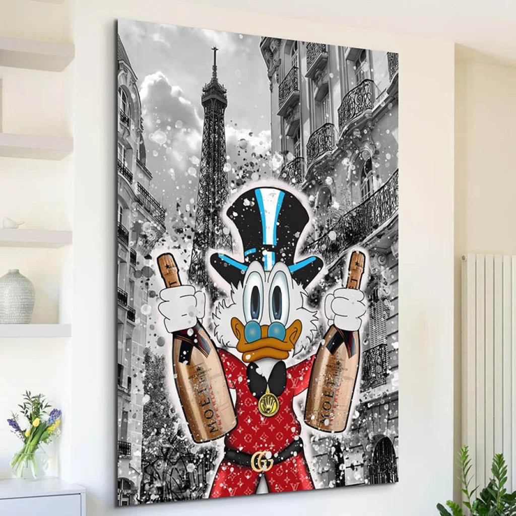 Plongez dans l’univers flamboyant de la street culture parisienne avec notre tableau "Rich Duck in Paris" : une création audacieuse, entre art urbain, luxe ostentatoire et esprit cartoon qui ne passe pas inaperçu. Cette œuvre déco pop et décalée met en scène un canard richissime, inspiré d’un personnage bien connu, posant avec deux bouteilles de champagne Moët & Chandon au cœur de Paris, la tour Eiffel en fond.