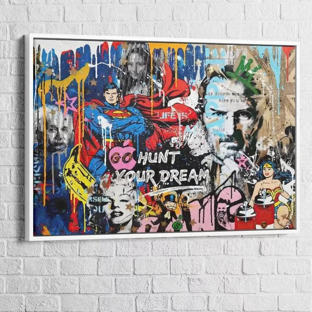 Ce tableau, représentant Steve Jobs avec l'inscription "Hunt Your Dream", capture l'esprit d'innovation, de détermination et de rêve qui caractérisent le Street Art. Avec ses couleurs vives et ses motifs audacieux, il est parfait pour ajouter une touche de caractère et de personnalité à n'importe quelle pièce.