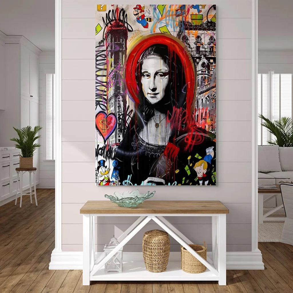 "Urban Mona" se marie bien avec de nombreux décors, des plus modernes aux plus classiques, grâce à son mélange unique de motifs anciens et nouveaux. Elle s'intègre parfaitement dans divers environnements, offrant une adaptabilité rare pour un tableau street art.